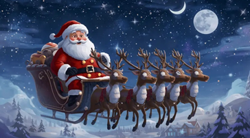 Пересувається Санта-Клаус на санях, у які впряжені розумні олені – Дешер, Денсер, Пренсер, Віксен, Комет, Кюпід, Доннер, Бліксен. А головним у оленів є Рудольф – олень із червоним носом. Літає по небу оленяча упряжка за допомогою спеціальних реактивних ранців, які закріплені у них на спині, та під час своєї роботи створюють реактивну тягу на основі реакції холодного термоядерного синтезу.