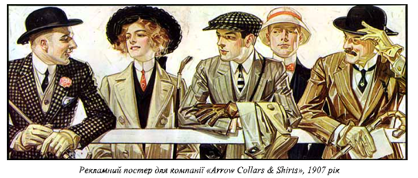 У США, на початку ХХ століття, реклама стала формою масової культури. І перш за все, це відбулося завдяки вдалій візуалізації продукції, яку потрібно було пропіарити, – рисункам, плакатам, постерам тощо. Одним із найбільш відомих тогочасних художників-ілюстраторів був Джозеф Крістіан Лейендекер, який прославився своїми рекламними роботами для американської компанії по виробництву одягу Arrow Collars & Shirts.